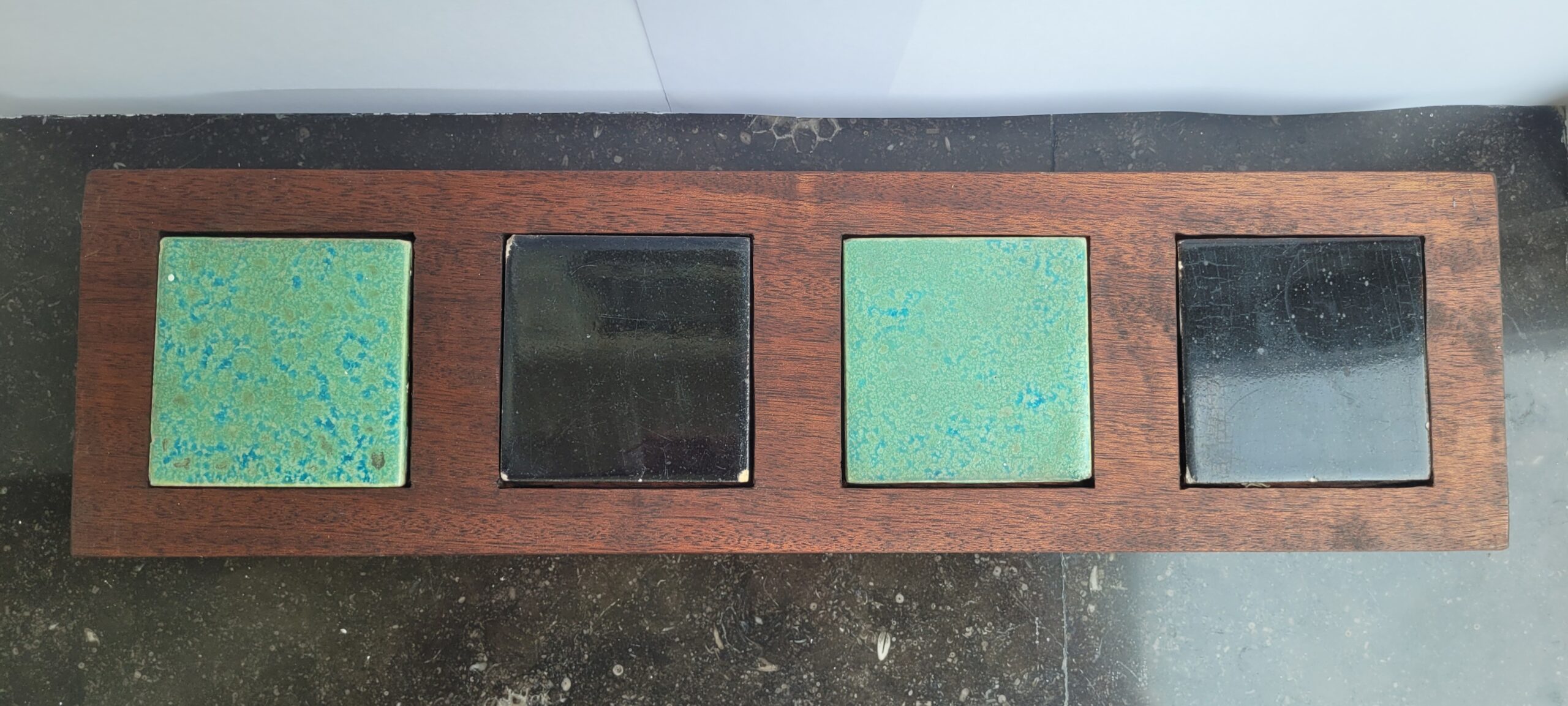 Handgemaakte borrelplank/accesoire van oude traptreden met verwisselbare keramische tegeltjes uit een gevel in Utrecht.