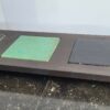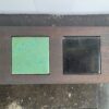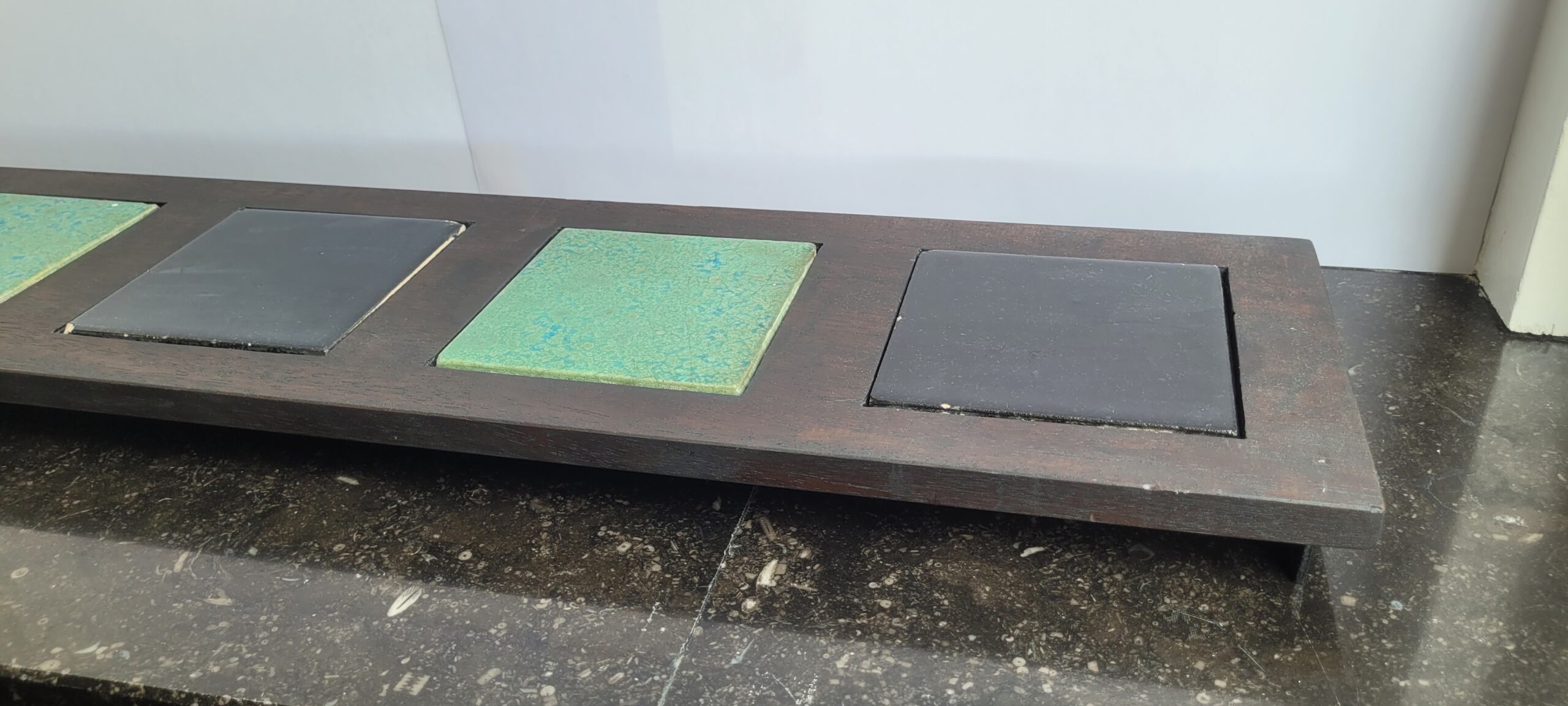 Handgemaakte borrelplank/accesoire van oude traptreden met verwisselbare keramische tegeltjes uit een gevel in Utrecht.