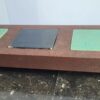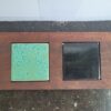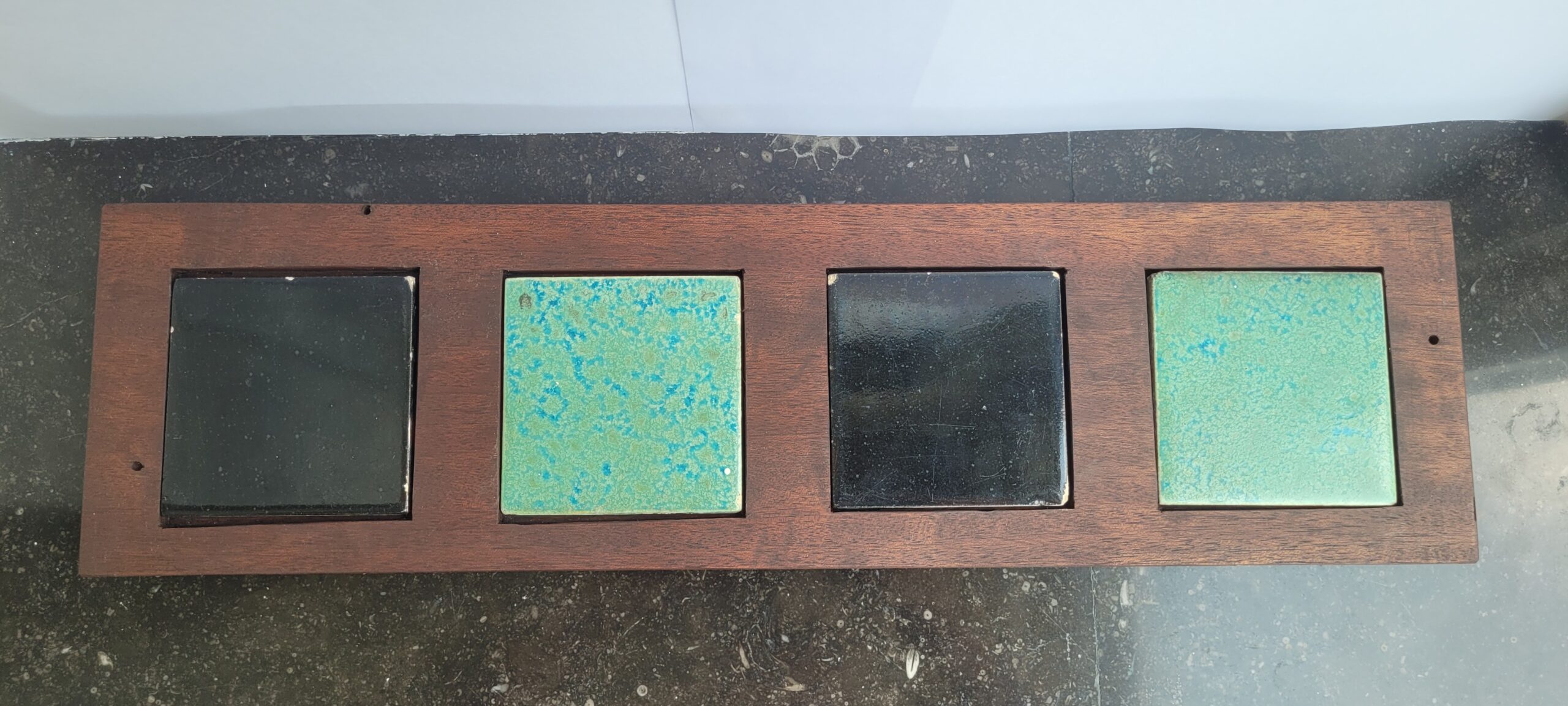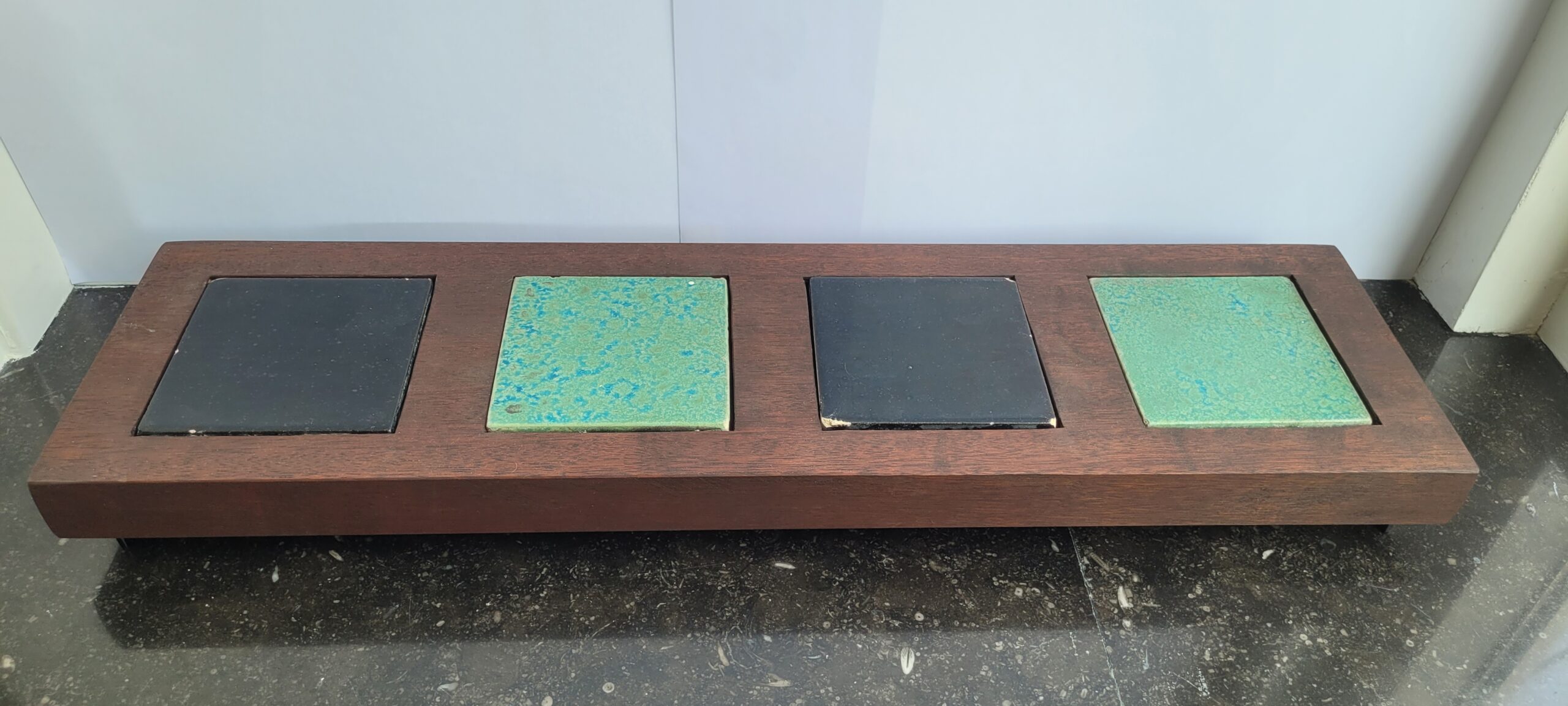 Handgemaakte borrelplank/accesoire van oude traptreden met verwisselbare keramische tegeltjes uit een gevel in Utrecht.